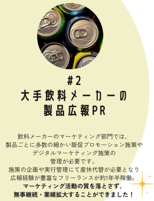 製品ごとの細かい販促プロモーションや、代理店コントロールが必要なポジション。広告代理店と事業会社の両方の経験を持つフリーランスが、1年半にわたり安定稼働しました。