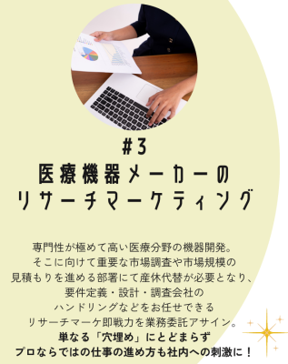 医療分野という特殊な知識が必要な市場調査業務。シンクタンク出身のプロ人材がフルリモートで参画し、単なる調査だけでなく、社内に新しい視点をもたらしました。