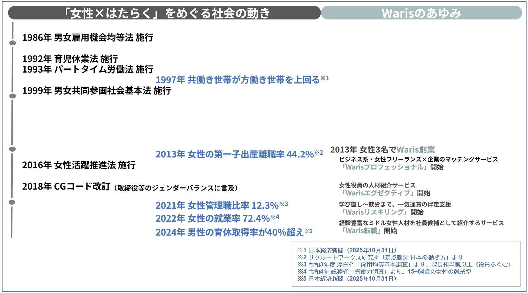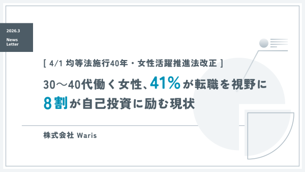 女性の多様な働き方への支援を通じて、すべての人の自分らしい人生を応援する人材サービス企業株式会社Waris(所在地:東京都港区、共同代表:米倉史夏、田中美和、河京子、以下Waris)は、2026年4月1日に、「男女雇用機会均等法」が施行40年を迎えると共に、「改正女性活躍推進法」の施行により、従業員101人以上の企業でも「女性管理職比率」や「男女の賃金差異」の公表が義務化されるのを前に、この40年の歩みを振り返るとともに、30~40代女性の”現在地”を、「仕事への満足度」や「キャリア展望」に関する調査結果などからご紹介します。
